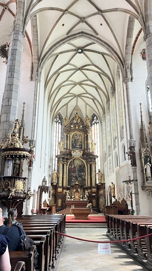 広場のすぐそばにある聖ヴィート教会(Church of St. Vitus)は、建設が1407年から1439年にかけて行われた初期ゴシック様式の教会。内部は美しいフレスコ画やステンドグラスに彩られ、17世紀製の貴重なオルガンも備えていました。