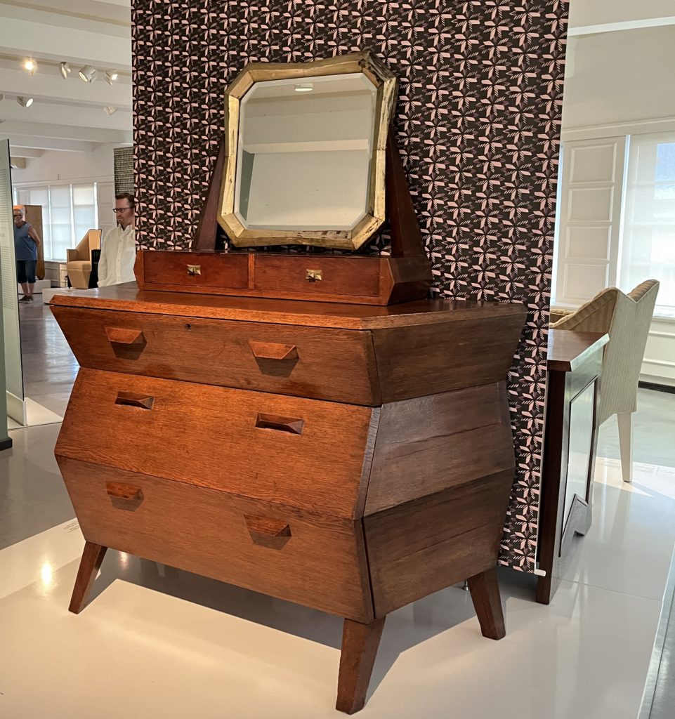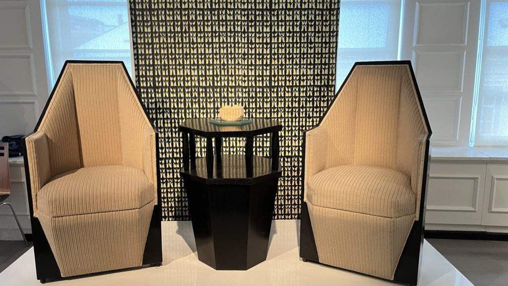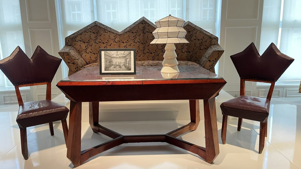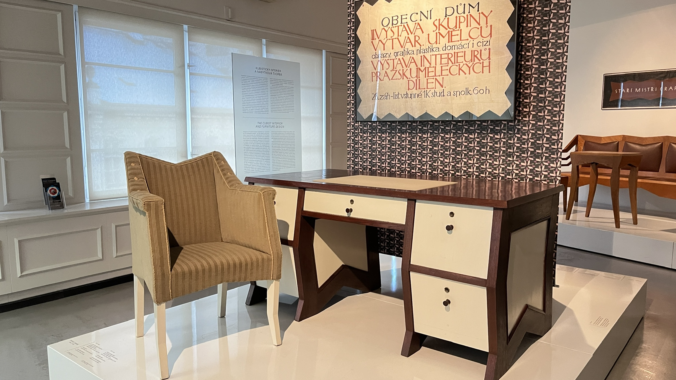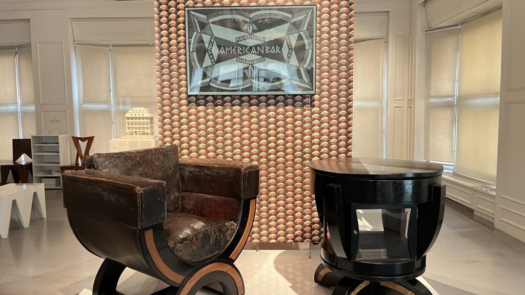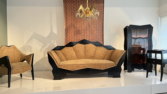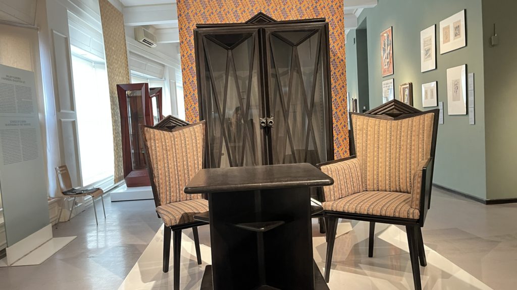 展示室では「The Oblique Plane and the Crystal(斜めの平面と結晶)」というテーマが掲げられ、パヴェル・ヤナークら建築家の理論と実作が紹介されていました。絵画での断片化や多視点の表現が、そのまま家具や建築に応用され、結晶体のようなフォルムとして立ち上がっているのです。椅子やキャビネットといった日用品でさえ、まるで彫刻作品のような存在感を放ち、芸術と生活の境界が消えていく感覚に心を奪われました。