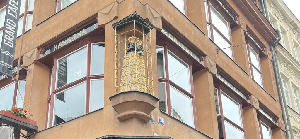 キュビズムミュージアムが入っているのは、「黒い聖母の家(Dům U Černé Matky Boží)」。ヨゼフ・ゴチャールの設計による代表的なキュビズム建築。外観は鋭い角度を持つ窓や幾何学模様に彩られています。カフェが入っており、インテリアもキュビズム建築。建築全体がアート作品。キュビズムデザイン雑貨が手に入るお土産屋さんも一階に入ってます。