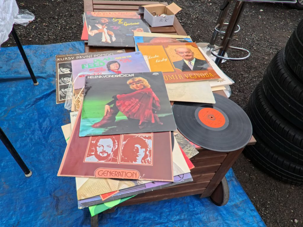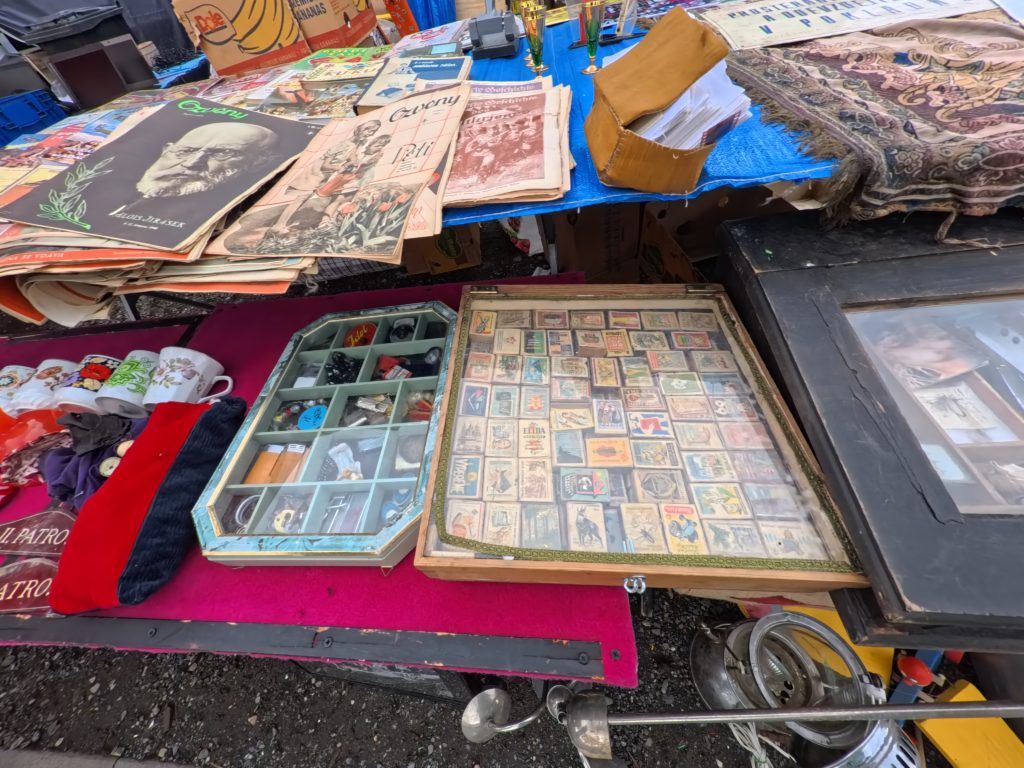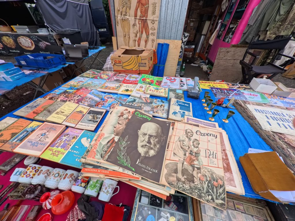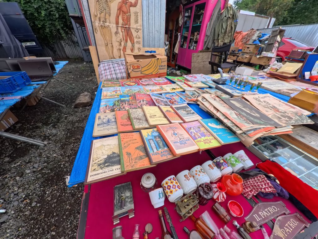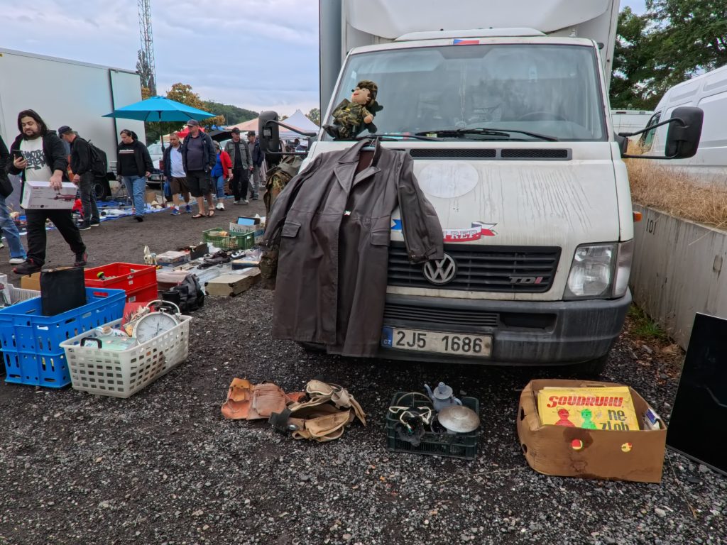 U Elektryでは、計画されたブースはほぼ存在せず、テーブルや車のトランク、地面に敷いたタープの上に雑多に並ぶアイテムたちが、まるで“宝の山”。共産党時代の記念品、ミリタリーグッズ、家具や衣料、レコード、コードレス機器、楽器、さらにはタイヤや冷蔵庫まで、ヴァラエティは無限。
