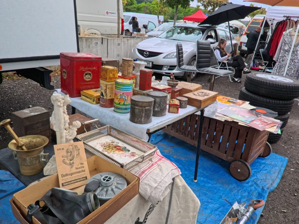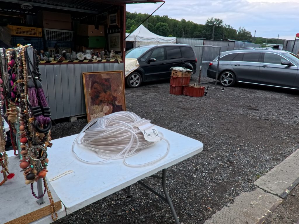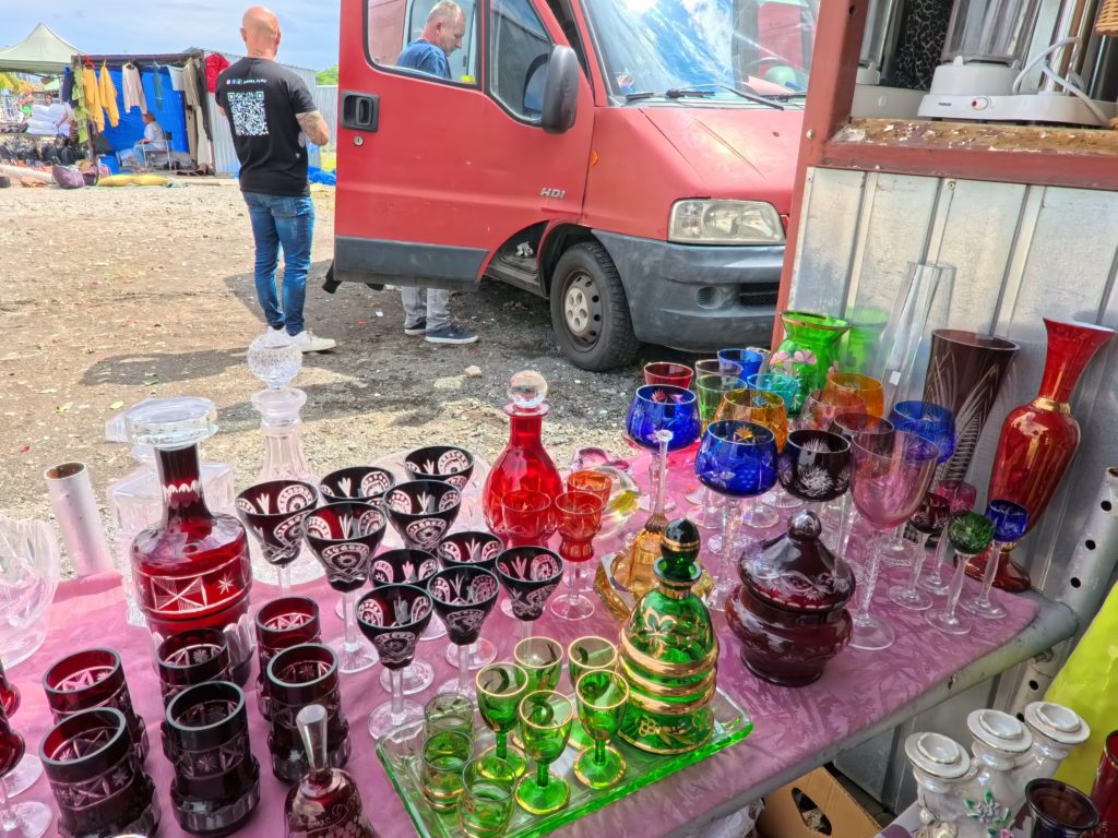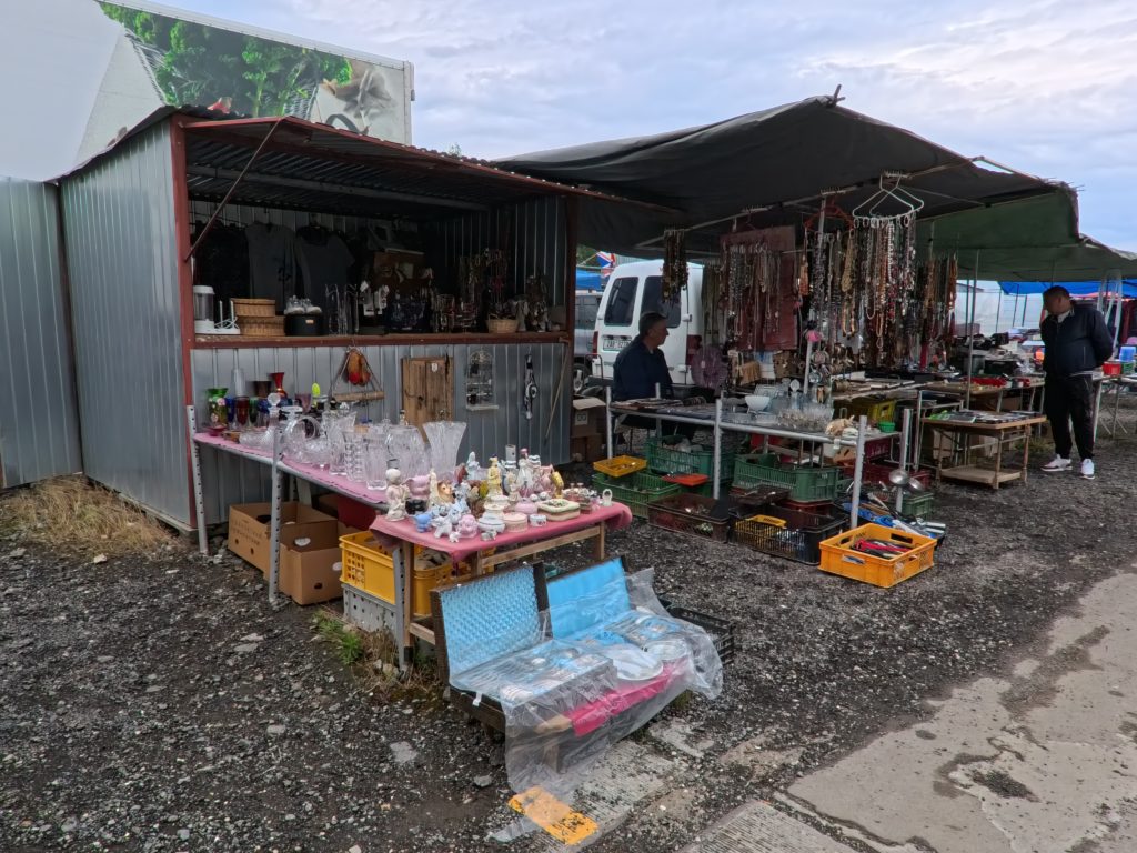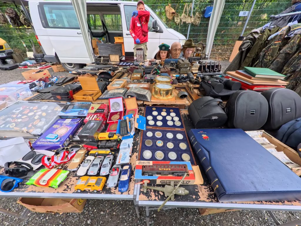 U Elektryでは、計画されたブースはほぼ存在せず、テーブルや車のトランク、地面に敷いたタープの上に雑多に並ぶアイテムたちが、まるで“宝の山”。共産党時代の記念品、ミリタリーグッズ、家具や衣料、レコード、コードレス機器、楽器、さらにはタイヤや冷蔵庫まで、ヴァラエティは無限。