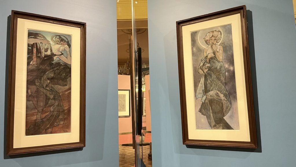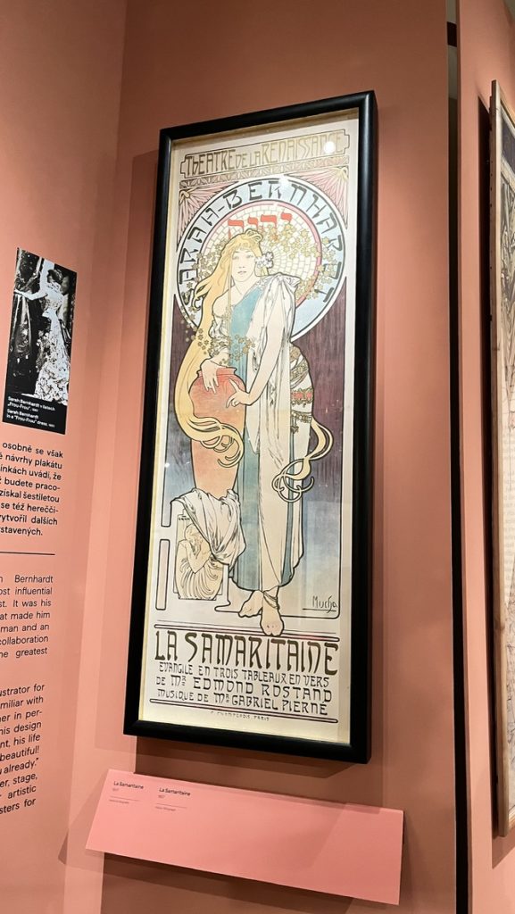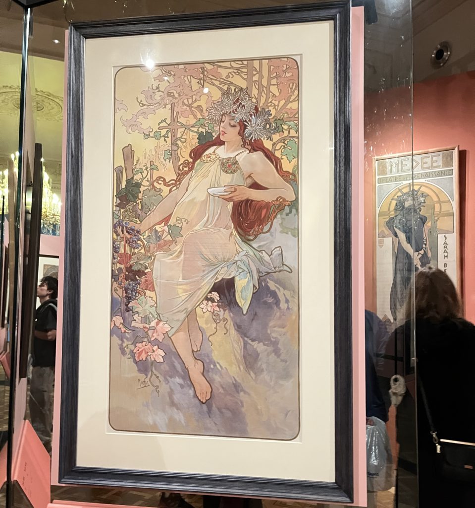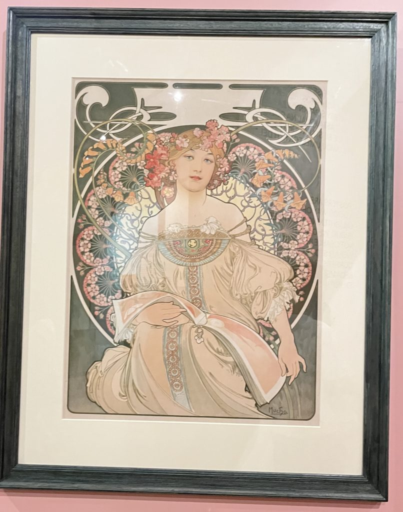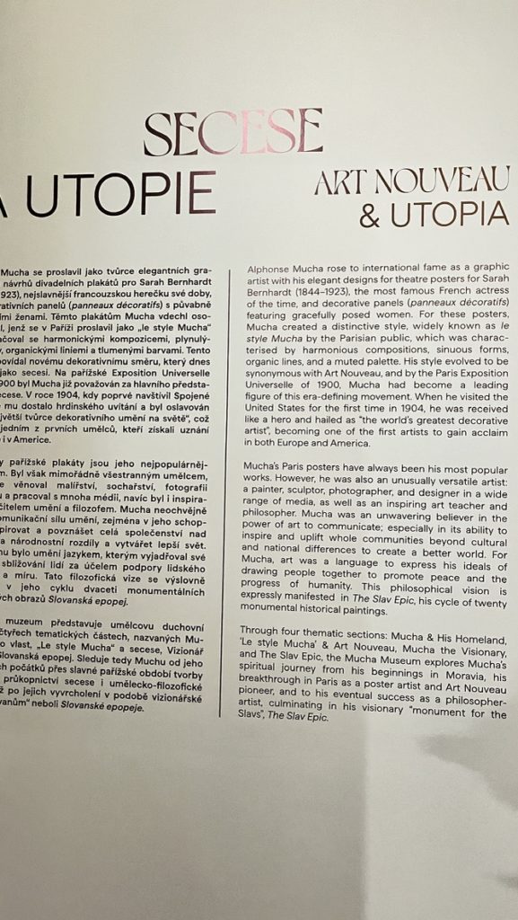 美術館の入口には「ART NOUVEAU & UTOPIA(アール・ヌーヴォーとユートピア)」という展示テーマが掲げられています。ミュシャはサラ・ベルナールの劇場ポスターで名を上げ、流れるようなラインと柔らかな色彩で「ル・スタイル・ミュシャ」と呼ばれる独自のスタイルを確立しました。