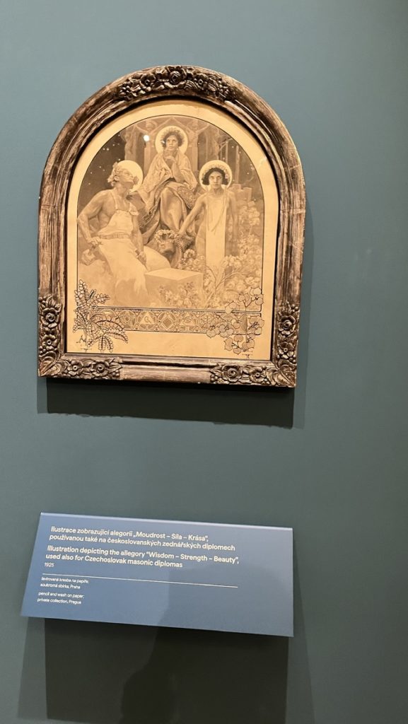 さらに展示では、ミュシャの思想家としての側面にも触れています。彼はフリーメイソンの思想に影響を受け、芸術に「真・善・美」を込めることを使命としました。