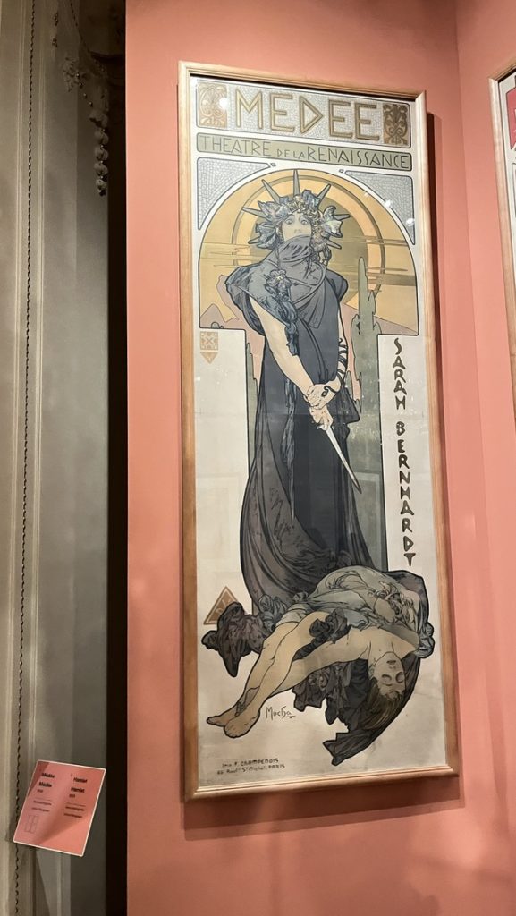 また、後の大きな転機となるのが、劇場女優サラ・ベルナールとの出会い。彼女のために描いたポスター《ジスモンダ》が大評判となり、ベルナールは6年間の専属契約を彼に与えました。まさにここから、ミュシャの名がパリ中に知れ渡ったのです。展示パネルを読みながらそのポスターを眺めていると、当時の観客と同じように心を奪われてしまう感覚がありました。