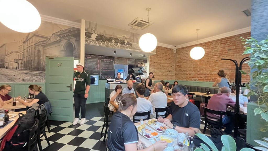 野菜スープやピエロギ(ポーランド風餃子)が人気。地元の学生や年配の方で賑わう、ほっとする雰囲気。ランチセットは38PLN ~