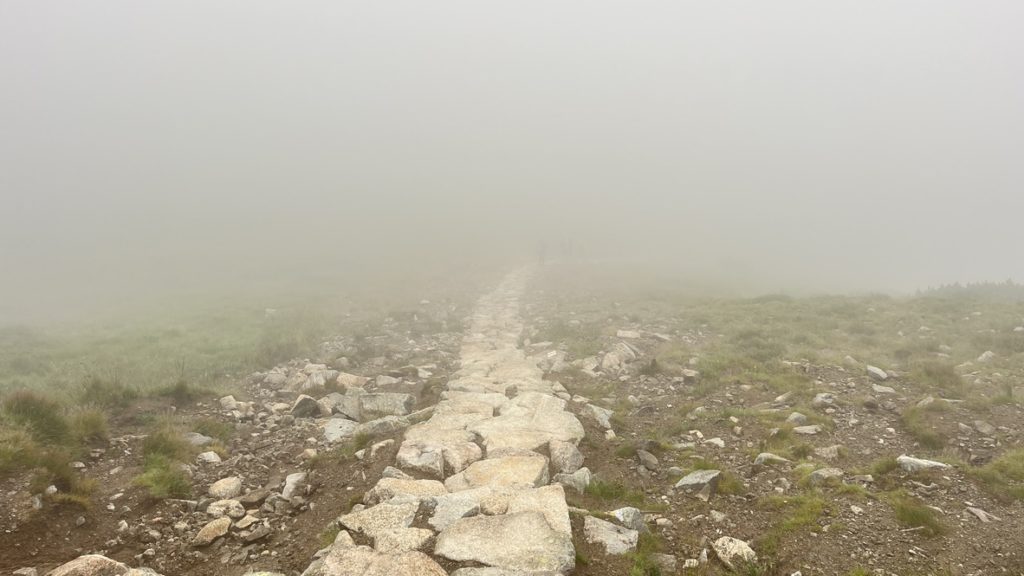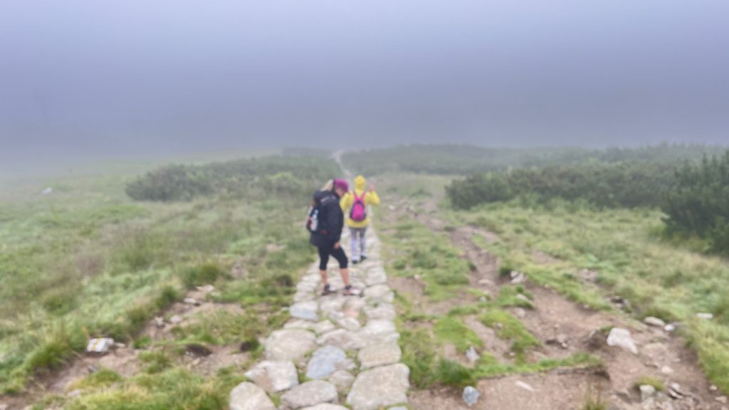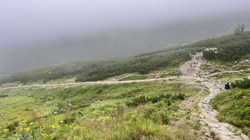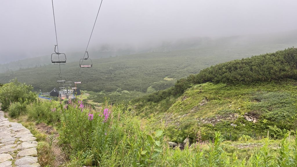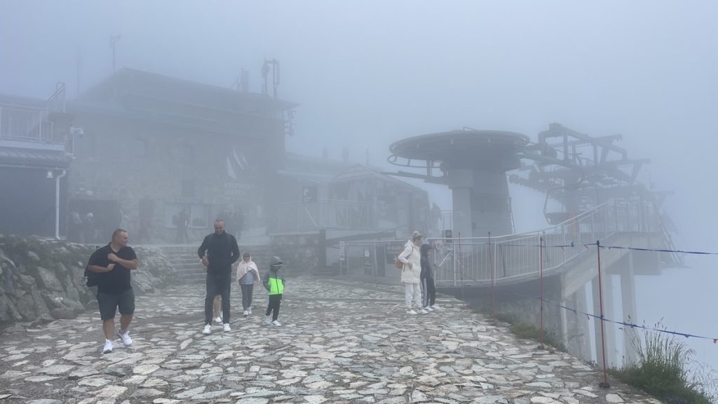 ようやく山頂に到着。温度差が激しくて、思わずくしゃみが出てしまいました。夏でしたが生憎の天気で気温は下がり、寒くてカフェでコーヒーを飲み体を温めました。それもそのはず、頂上は標高1,987m。ここからはポーランドとスロバキアの国境が見渡せ、切り立つ岩壁と緑の谷が織りなす絶景が広がっています。本来なら美しい稜線とスロバキア側の山脈まで一望できるのですが、今回はあいにくの雨と霧で視界はゼロ。