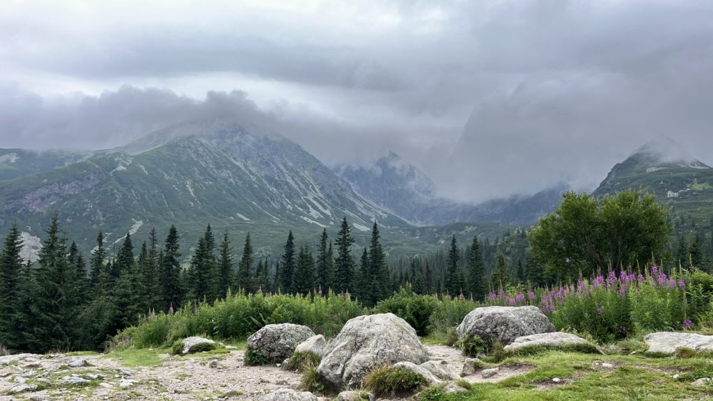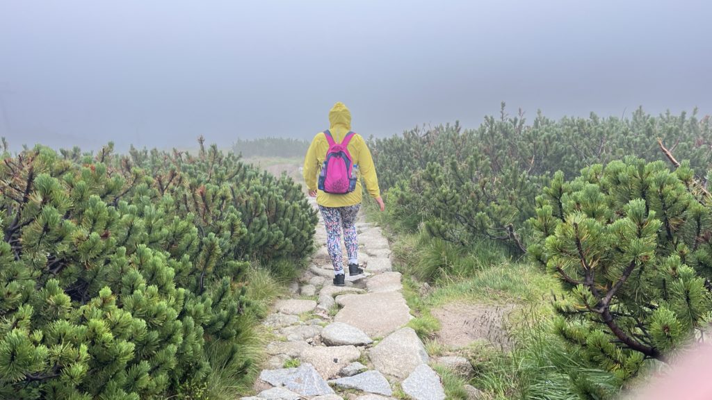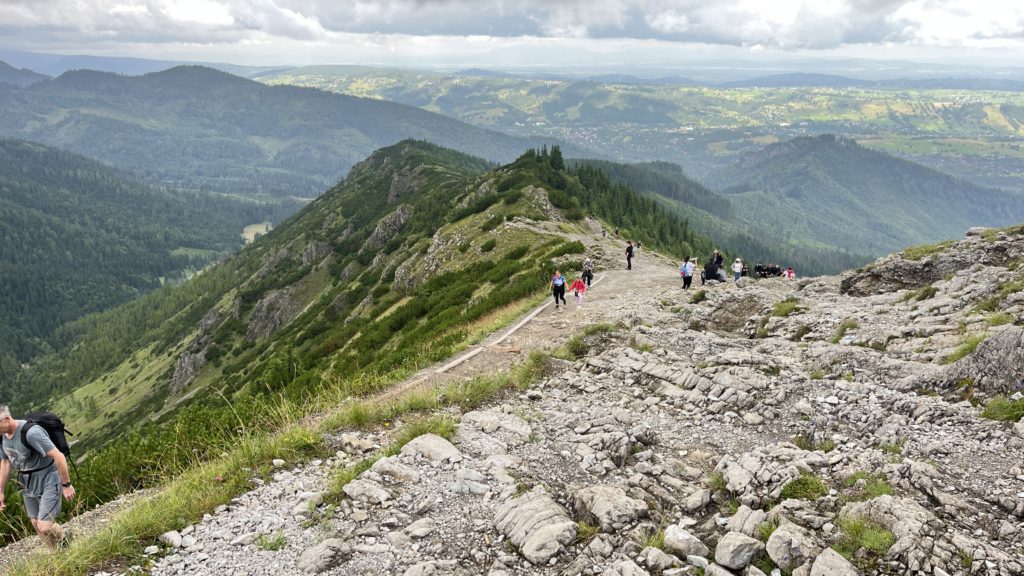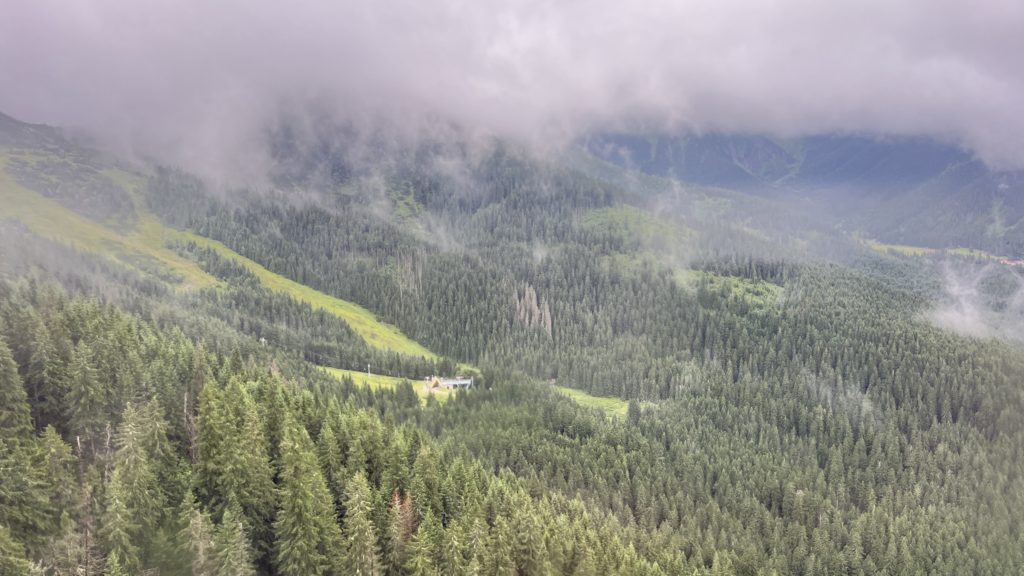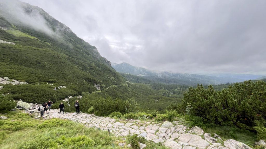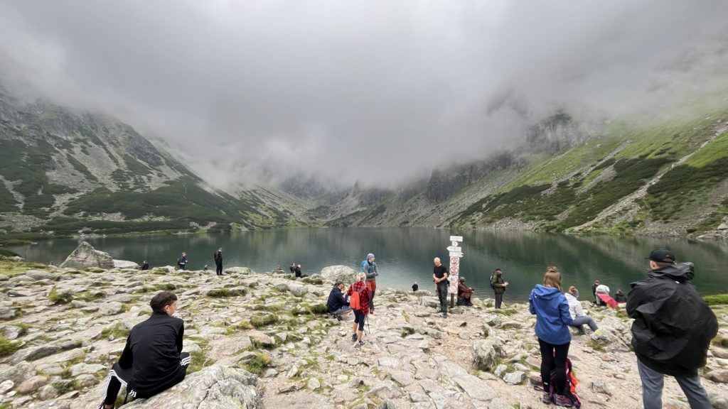 ようやく山頂に到着。温度差が激しくて、思わずくしゃみが出てしまいました。夏でしたが生憎の天気で気温は下がり、寒くてカフェでコーヒーを飲み体を温めました。それもそのはず、頂上は標高1,987m。ここからはポーランドとスロバキアの国境が見渡せ、切り立つ岩壁と緑の谷が織りなす絶景が広がっています。本来なら美しい稜線とスロバキア側の山脈まで一望できるのですが、今回はあいにくの雨と霧で視界はゼロ。